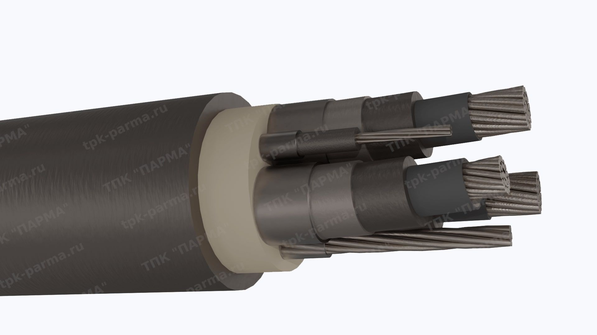 1. Три многопроволочные медные лужёные круглые основные жилы с площадью номинального поперечного сечения 50 мм2, соответствующие 5 классу по ГОСТ 22483-2012.